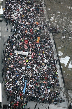 Over 70,000 New Yorkers from neighborhoods across the city rallied at City Hall on March 5 to push for fair fiscal alternatives to the devastating budget cuts being considered in Albany and New York City. In a show of solidarity, the broad coalition of labor unions, community groups and families held a “Rally for New York” to protest the proposed state and city budget cuts to public services, education, health care and other programs that would have a devastating impact on the children, families and economy of New York.